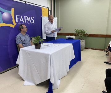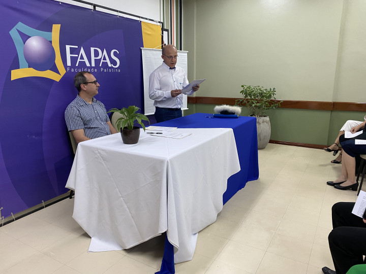O momento foi presidido pelo Professor Mércio José Cauduro, Coordenador do curso de Teologia da FAPAS, e pelo Coordenador Acadêmico Jolair da Costa Silva que representou o Diretor-Geral da Faculdade Palotina, Professor Jadir Zaro.