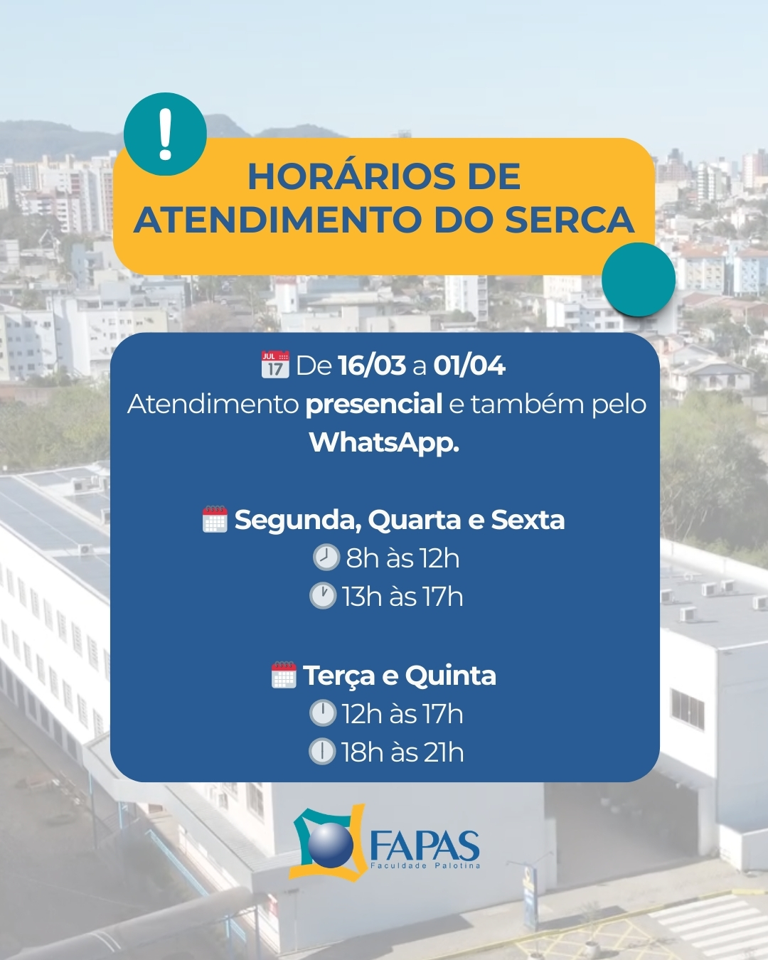A Secretaria Acadêmica (SERCA) informa que, no período de 16 de março a 1º de abril, o atendimento será realizado presencialmente e também por WhatsApp, conforme os horários abaixo:
