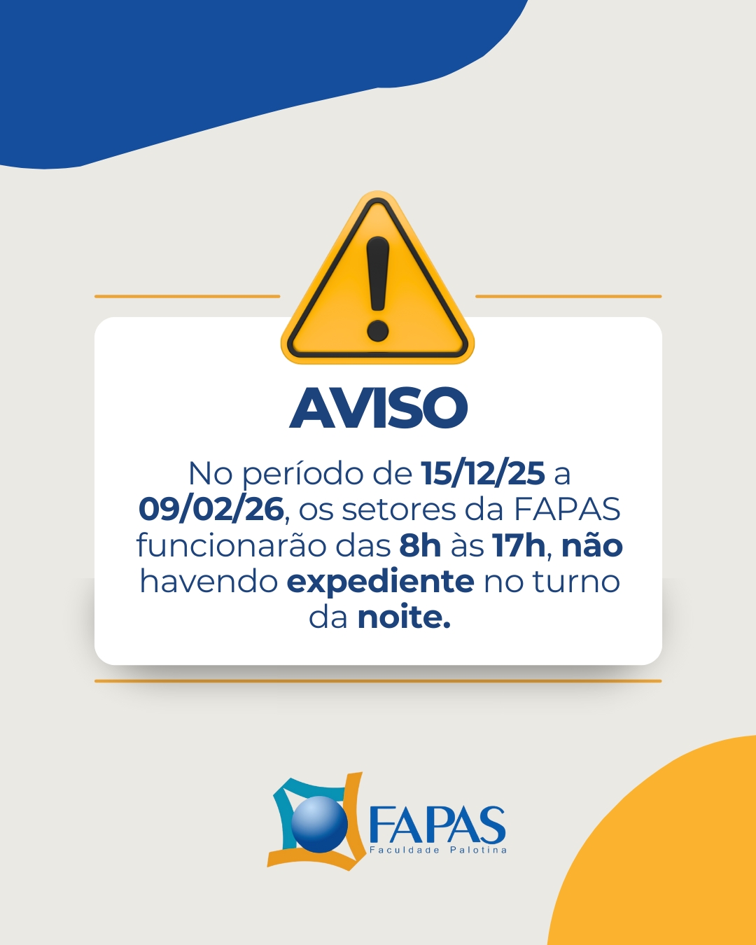 A partir de hoje, 15 de dezembro de 2025, a Faculdade Palotina estará funcionando em horário especial, das 8h da manhã até às 17h.